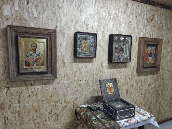 В храме уже хранится ковчег с мощами святого воина великомученика Фёдора Стратилата — небесного защитника воинов. К нему прикладываются, молятся, просят помощи в ратных делах. А ещё здесь — иконы, отбитые разведчиками у мародёров в Артёмовске. «После окончания спецоперации мы найдём им место в каком-нибудь храме местной епархии», — замечает отец Максим.