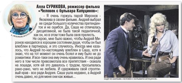 — Сомневаюсь в сумасшедшей любви между ними, которую она описала в своей книге. На моих глазах Андрей Миронов шарахался от нее — убегал за кулисы, в гримерки, явно считал «навязчивой женщиной». Признаюсь, я не застал пик их любви в Театре сатиры, только «послевкусие». В этом «послевкусии» между Андреем и Татьяной не было и намека на любовь. Впрочем, есть разные виды любви и влюбленности, а у артистов — это целый спектр отношений. Но лично я не верю в огромную любовь Андрея Александровича и Татьяны Егоровой.