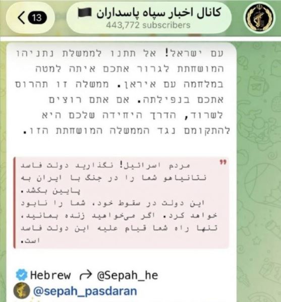 Сегодня, 26 марта, на канале Корпуса стражей исламской революции (КСИР) появилось сообщение на иврите, которое адресовано израильтянам. В нем содержится призыв к народу восстать против «коррумпированного правительства» Биньямина Нетаньяху.
